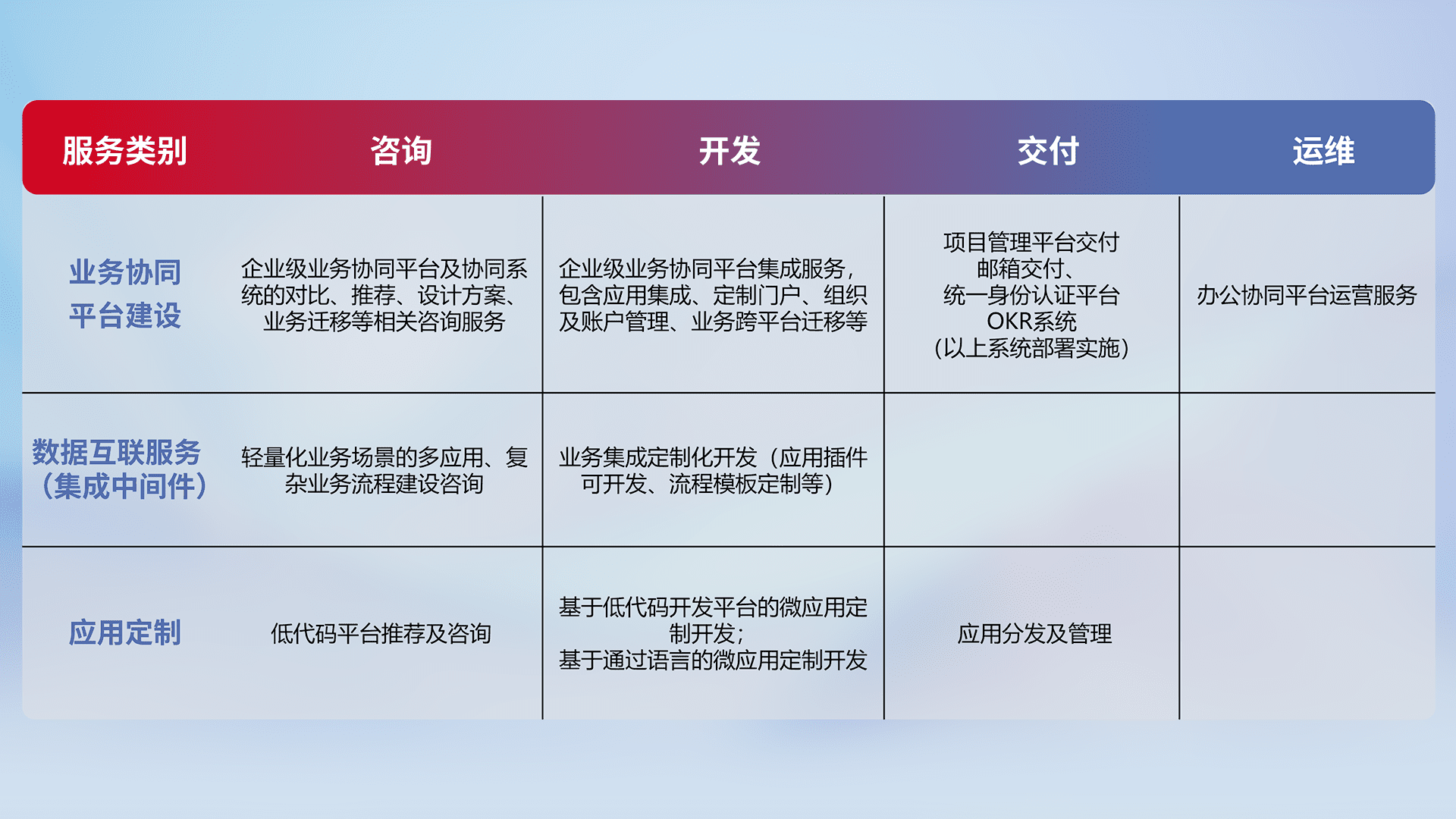 针对钉钉、、企微、、IDaas等平台级产品提供产品的规划、、、、方案、、、、交付、、、、定制化开发等服务,,,实现如统一协同办公、、、、智能客户服务、、、混合会议管理、、、、智能数据查询、、等业务场景,,,实现数字化转型。。。。